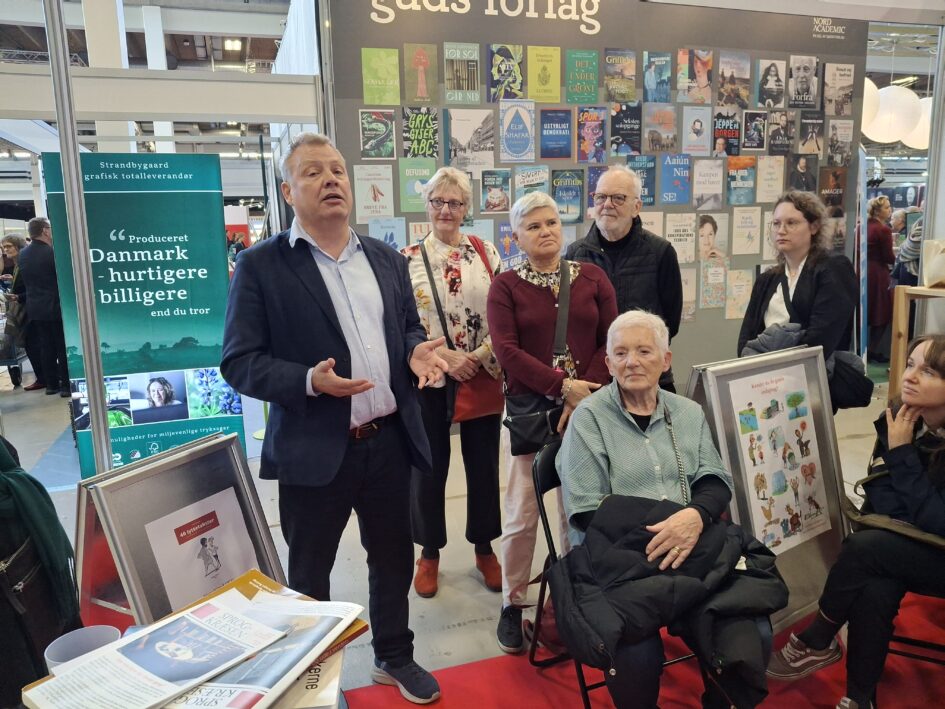 Jarl Cordua, der netop er blevet udnævnt til bestyrelsen i Dansk Sprognævn, besøgt på Bogforums første dag Forlaget Bostrup og Den Danske Sprogkreds’ stand og diskuterede sprogpolitik med Lise Bostrup.